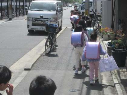 入学式の次の日から,集団下校もこれで3日目。こどもたちもだんだん慣れてきて,並ぶのも速く,きれいにできるようになってきました。今日は雨も降らず,とてもスムーズに下校できました。明日からは給食が始まるので,下校は午後1時30分ごろの予定です。