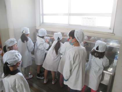 給食当番の子どもたちは,エプロンに着替えて,手を洗って,勇んで給食室に向かいます。