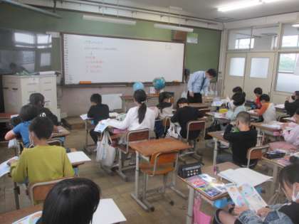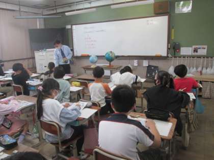 地球儀や地図帳などの資料を使って必要な情報を集め,国土の様子について理解する学習です。今日は,地球儀を使って,日本の位置や赤道などについて確認しました。