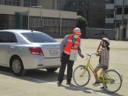 4年生の自転車安全教室を実施しました。南警察署と地域の方々にお越しいただき,運動場につくられたコースを走りながら,安全な自転車の運転について教えていただきました。自転車による重大事故が年々増えています。今年の4月からは,自転車に乗るときのヘルメット着用が努力義務になりました。交通ルールを守って,安全に自転車に乗れるようになってくださいね。