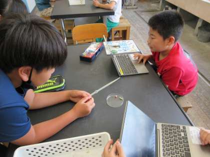 子ども達は理科の学習で、種子が発芽するために、水の他に何が必要なのかを予想したことを話しあったり、ヨウ素液を使って,種子の中に含まれる養分を調べたりしながら、植物の発芽と成長について学習を進めています。