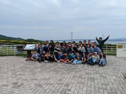 淡路サービスエリアで休憩して、明石海峡大橋をバックに学級写真をとっていただきました。雨はまだ降っていません。