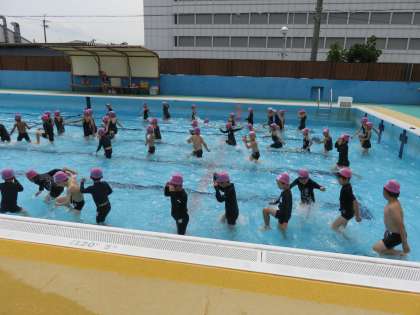 今日はとても蒸し暑く,午後の気温はプールサイドで30度ぐらいまであがっていました。とても気持ちのよい水慣れ初日でした。安全に十分気を付けて,これからもめあてにむかって活動を進めていきます。