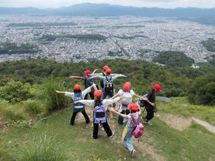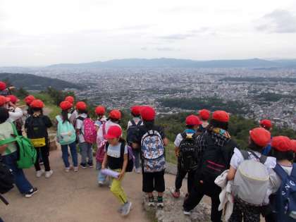 社会科「京都市の様子」の学習の一環として、大文字山に登り、京都市の地形や市内の様子を確認する社会見学を実施しました。