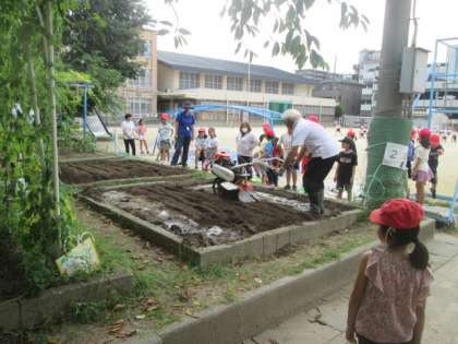 今日も,前回来ていただいた村田さんにお越しいただき,九条ネギを植えました。前回耕してシートをかぶせておいた畑の土は,見違えるようにふかふかになっていて,今日は肥料を混ぜて,ネギを植えるところまで教えていただきました。