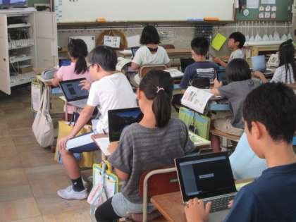 自然災害から私たちを守るための設備や取組について,GIGA端末を使って調べています。これから,秋は台風がたくさんやってくる季節でもあります。自然災害はいつやってくるかわかりません。学習をもとに,自分たちでもできることについて,考えていきます。