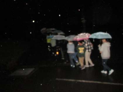 残念ながら,夜に雨が降り出しました。楽しみにしていたナイトハイクは,傘を差しながらの実施になってしまいました。班にひとつずつ,ランタンを持って,みんなで所内を一周しました。昼にウォークラリーで通った道も,夜は雰囲気が全く違います。