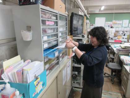 子どもたちが学習に使用するプリントを準備してくれている校務支援員。