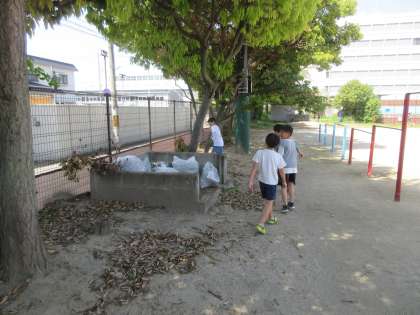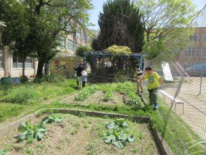 その後、運動場へ場所を移し、生きものを見つける学習をしました。事前に確認した「動くいきもの、動かない生きもの」の視点で、子どもたちは見つけようとしていました。