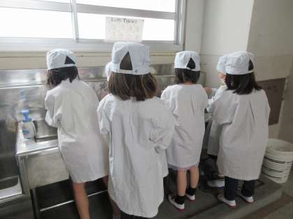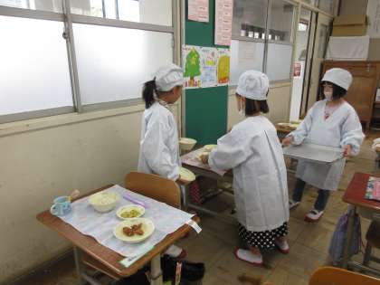 給食が始まり、当番活動もがんばっています。給食室から教室へごはんやおかずを運んだり、クラスのみんなに配膳したりすることは大変ですが、友達と協力しながら、少しずつできるようになってきています。