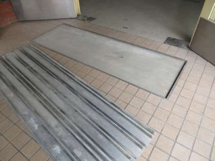 校舎玄関の金属製のすのこも取り外して、ほこりや砂をきれいに取り除いてくれました。