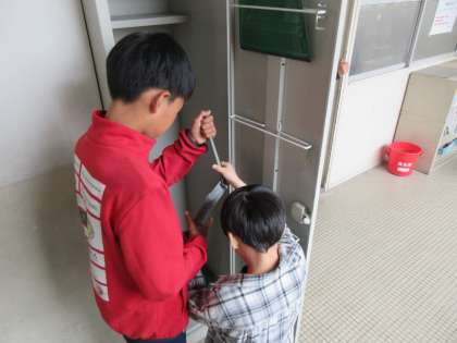 「そうじ用具はこのロッカーにしまうよ。」