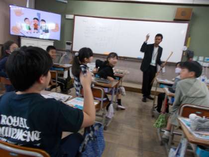 新しくALTのジュン先生が来てくれました。自己紹介を聞いたり、じゃんけんゲームをしたり、楽しく大盛り上がりの時間になりました。ジュン先生、1年間よろしくお願いします。