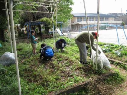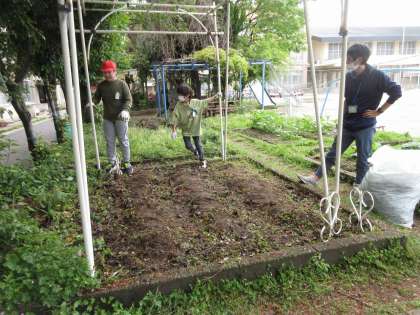 「やさいをそだてよう」(生活単元)の学習をはじめるため、学級園の土づくりをしました。野草がたくさん生えていましたが、みんなの協力で、きれいになりました。