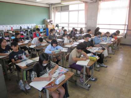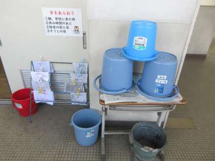 各教室前の廊下には、雑巾やバケツが置いてあります。