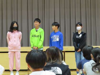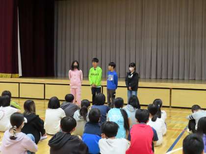 6年生の学年集会では、代表委員が前に出て、それぞれの思いを繋ぎながら学年目標を発表しました。