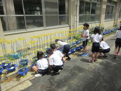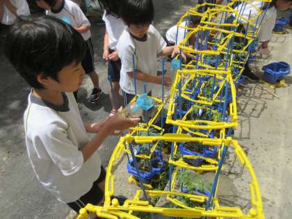 生活科「おいしいやさいをそだてたい」の学習で植えた”ミニトマト”にお水をあげ、早く実がなることを楽しみにしている子どもたち。