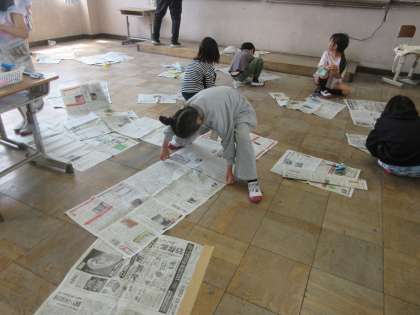 たくさんの新聞紙を前に「この新聞紙でどんなことができるかな。」と、担任が子どもたちに言葉を投げかけると、子どもたちは目を輝かせて、新聞紙を手に「造形遊び」をスタートさせていました。
