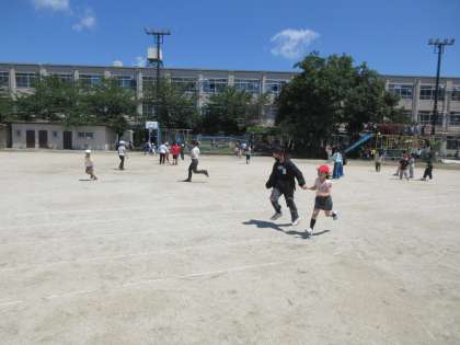 休み時間に、6年生の子どもたちが、1年生の子どもたちを遊びに誘って、元気に体を動かしています。