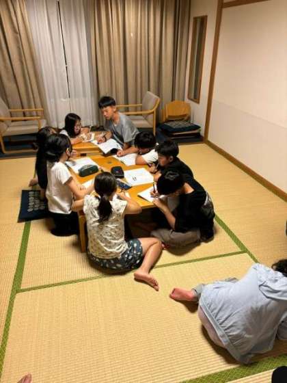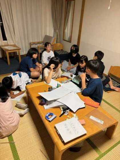 グループごとに、修学旅行1日目の活動を振り返ったり、行動の反省点と改善点を交流したりしています。