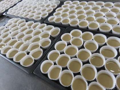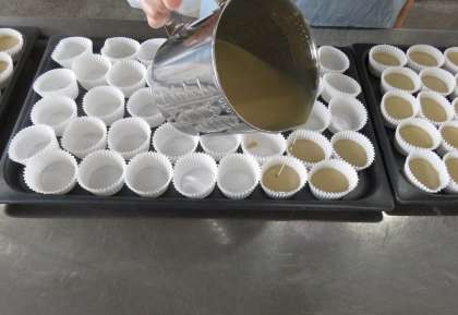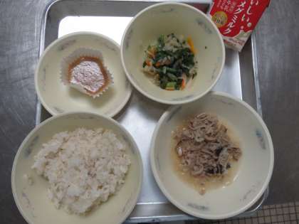 米粉と黒砂糖で作った液をカップに流し込みスチームコンベクションオーブンで蒸して作りました。1年生は初めてのういろうを「おいしい」と残さず食べてくれました。