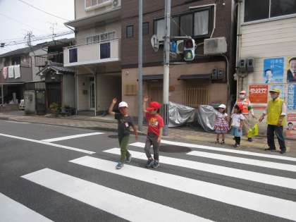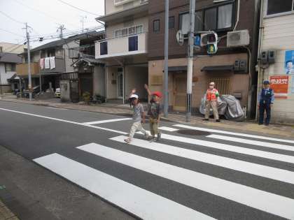 2時間目に、交通安全教室がありました。横断歩道を渡るときにはどのようなことに気を付けて歩くのかについてお話を聞き、しっかりと理解することができました。実際に歩いてみる前は「うまくできるか不安」という声もありましたが、上手に渡ることができて、笑顔になっていました。