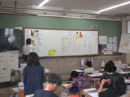 道徳の学習では教材文「ちこく」の内容を通して、相手の立場や状況を理解しようとしたり、分かり合おうとしたりすることの大切さについて考えました。