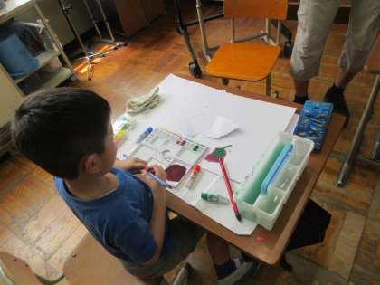 3組で育てている夏野菜の一つであるトマトが大きくなってきました。そこで、トマトをよく観察し、形や色、大きさをよく見て、絵で表現しました。