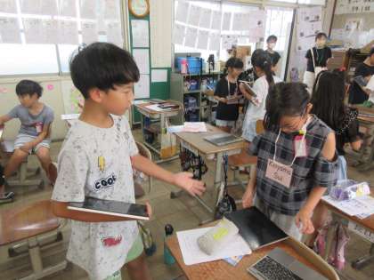 タブレットを使って、自分の好きな色や食べ物を友だちに紹介しました。友だちだけでなく、保護者の方にも伝えたり、あいさつをしたりと、今日ならではのコミュニケーションをとることができました。とってもよくがんばりました!