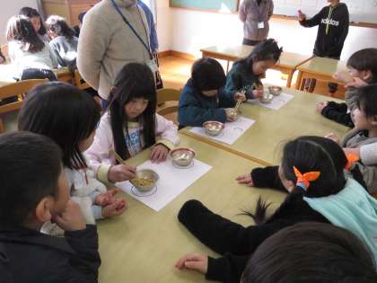 給食週間の取組で、豆つまみ大会が行われました。