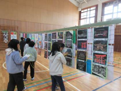 今週は体育館で九条塔南アート展を開いています。子どもたちは、普段目にしない他の学年の図工の作品を楽しそうに見ていました。