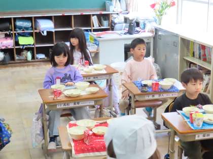 給食当番が配膳をしてくれている時間、静かに座って待つ子ども達の姿がありました。