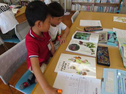今日の生活科「ぐんぐん そだて」の学習では、これから2年生の友達と一緒にどんな野菜を育てるのかを話し合いました。様々な野菜の本をもとに、みんなで考えた条件に合う野菜を探すことができました。「この野菜はどう?」「それならこっちの方が条件に合うよ」と、充実した話合い活動ができました。