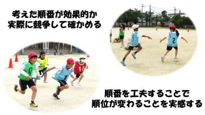 「こっちの順番のほうが速い」「走りながらバトンをもらうことをもっと意識しよう」と同じグループの人と相談しながら、学習することができました。