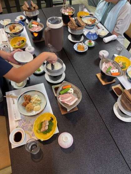九条弘道小学校のみなさんと、鳴門海峡の見える会場で、美味しい夕食の時間を過ごしています。