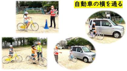 子ども達は、運動場で実際に自転車乗ることを通して、一時停止の仕方や停車中の車の横の走り方などを学びました。