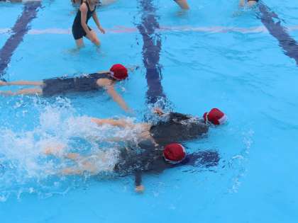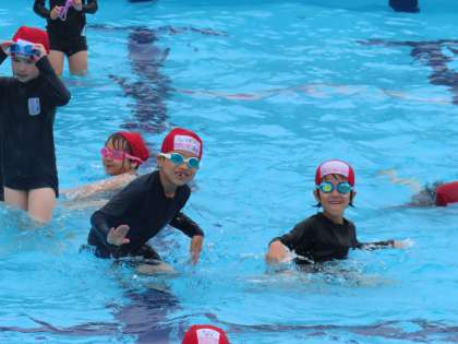 プールの使い方を教室で確認した後、子ども達は待ちきれない様子でプールに向かいました。
