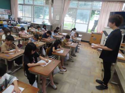 今日は5時間目にひらがな聞き取りテストを実施しました。特殊音節や音韻認識の習得支援を目的として、LD通級・ことばきこえの教室指導の先生の指導のもと、集中して取り組むことができました。