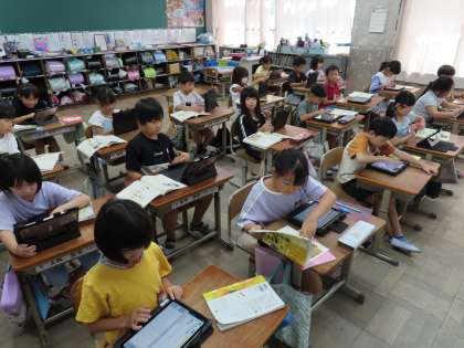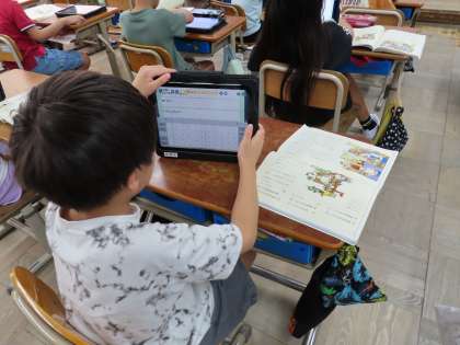今日の国語の学習では、夏休み中に読んだ本を友達に紹介するための準備をしました。今回は初めての試みとして、Ipadで学習用ソフトを活用しながら準備を進めました。初めは文字の入力に苦戦する様子もありましたが、徐々にスムーズに使いこなす児童の姿も見られるようになりました。