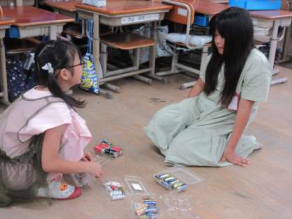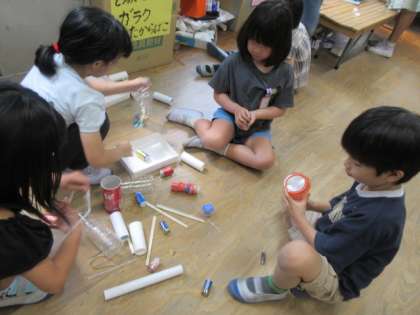 生活科の授業で、身近にある材料を使い、遊びながら発見したことや気づいたことをもとに、これからの学習を進めていきます。