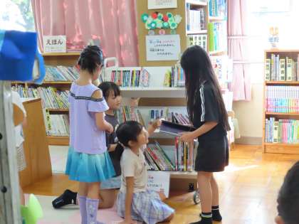 2年生では毎週図書室を利用して、読書を楽しんでいます。今日は学校司書の先生に読み聞かせをしてもらった後、新しく図書室に並べられた本を楽しむ様子が見られました。
