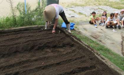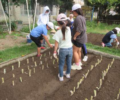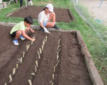 10cmほどに切ったネギを、土の中に根から2cmほど入れて植えました。