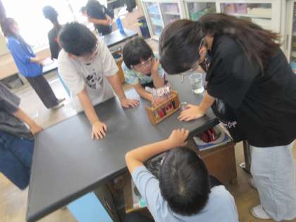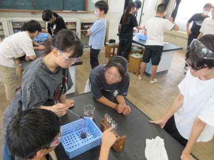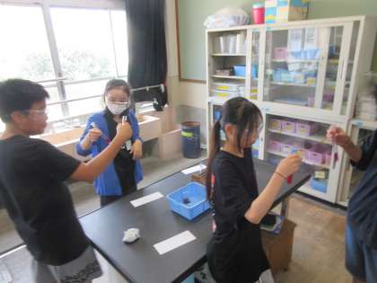 紫キャベツの汁を使って、水溶液の性質を調べました。水溶液の観察をして、「えっ!黄色になっている!」「ピンク色になってきた」など色の変化に気づきながら性質をまとめました。