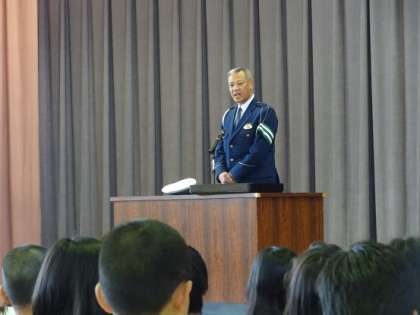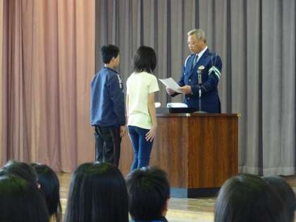 京都府南警察署 交通課の太田交通課長から児童代表2名に指定書を交付していただき,記念品も贈呈していただきました。日頃からお世話になっている見守り隊の皆様が来賓として参列していただく中で,太田課長の交通安全に対する呼掛けに対して,みんな真剣に耳を傾けていました。交通安全に対するみんなの強い決意を感じた時間となりました。