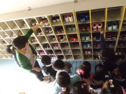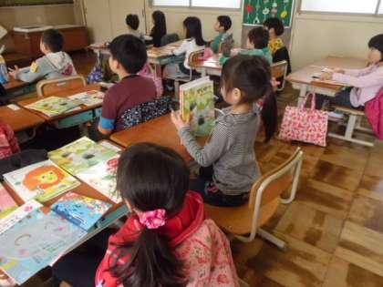 1年生は,トイレやくつ箱の使い方を教えてもらいました。教科書を机の上に出し,一冊ずつ確かめるときには, 背筋がピンと伸びていました。