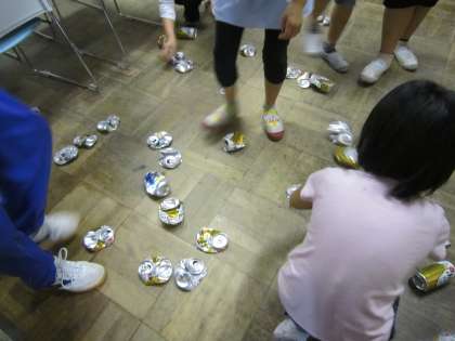 地域の方からたくさんの空き缶をいただきました。有志の子どもたちに空き缶を踏んでもらいました。すごい勢いで,バンバン踏んでくれました。子どもたちの額には汗がタラリ・・・。あっという間に,たくさんの空き缶がぺしゃんこになりました。
