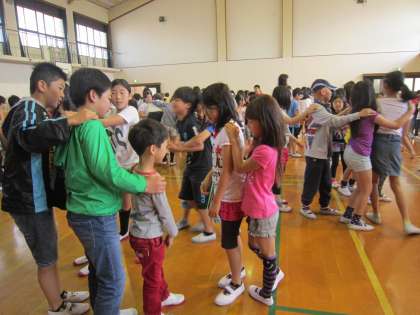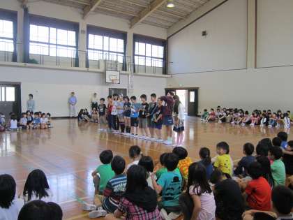 まずは,集会委員会の子どもたちによるゲーム「ジャンケンれっしゃ」です。音楽が止まったら,近くにいる人とジャンケンポン!繰り返しているうちに,どんどんどんどん,列が長くなりました。勝ち続けたのは,1年生でした!