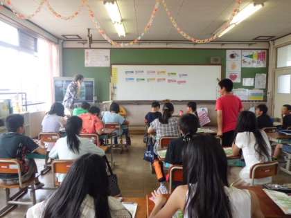 給食時間は,1〜4年生の教室で子どもたちと一緒にランチ。いっぱい質問が飛び交い,自然とコミュニケーションがとれました。
