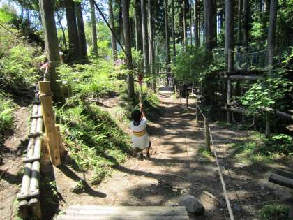 お腹がいっぱいになったところで,冒険の森でアスレチックに挑戦しました。木やロープ,チェーンで遊具が作られています。足をかける場所,手を伸ばすタイミングなど工夫しながら,全身を使ってのびのびと活動しました。
