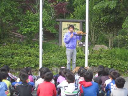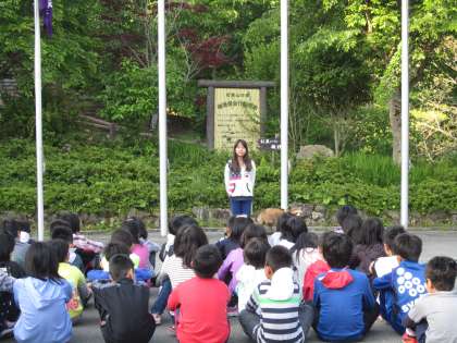 山の家で同じ日程で宿泊している3つの学校の子どもたちが,みんな集まり,朝の集いを行いました。所長さんからは,自然環境のことや生き物と共存していることなどについて,お話をしていただきました。また,学校紹介では,各校の代表児童が,学校の様子について話をしました。